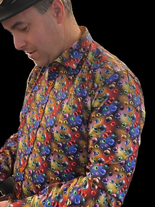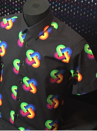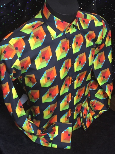 Fascinating looking slim fit black shirt with multi-coloured cube pattern. Wow factor, 100% Cotton, Italian Shirt.
