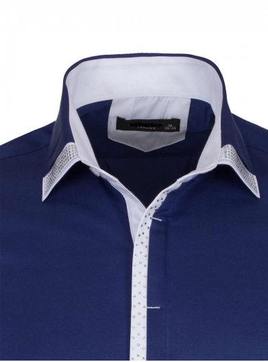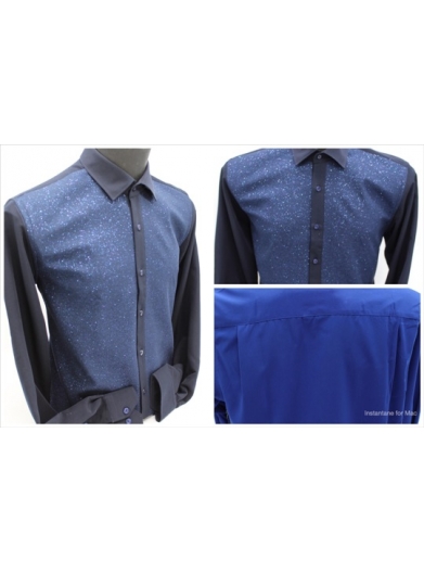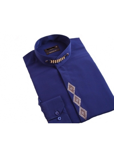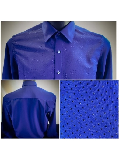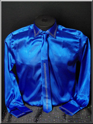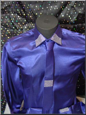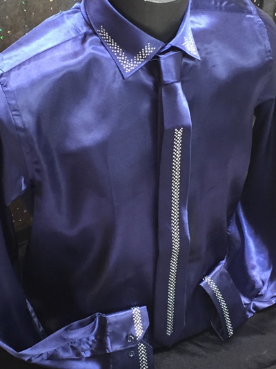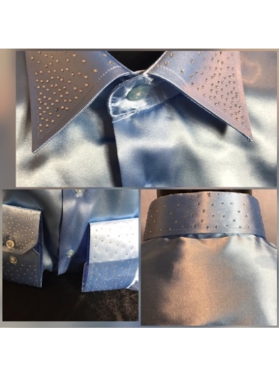 Elegant yet garish blue colour shirt with Diamanti on the colour, cuffs and it also has a matching Diamanti tie. The Diamanti creates an extra enchanted look yet mysterious.