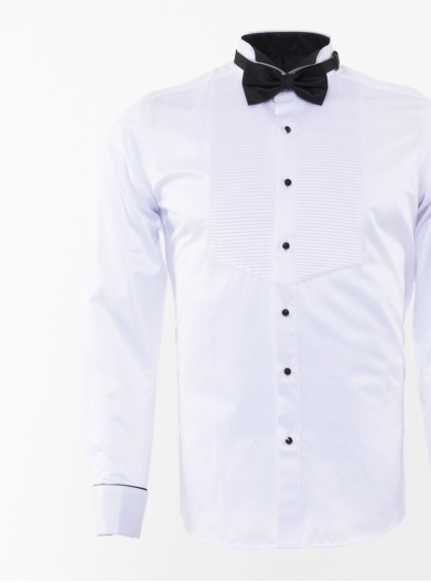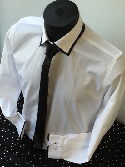 A smart dress white shirt with black strip around the collar and around the cuffs with matching black tie