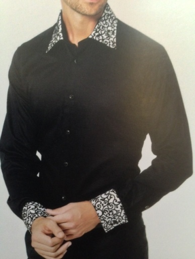 Sonata, this black slim fit shirt with a unique velvet design on the collars and cuffs. something different.