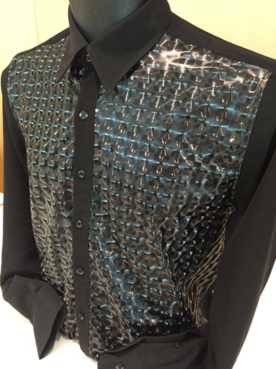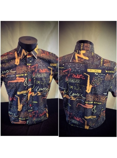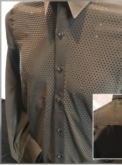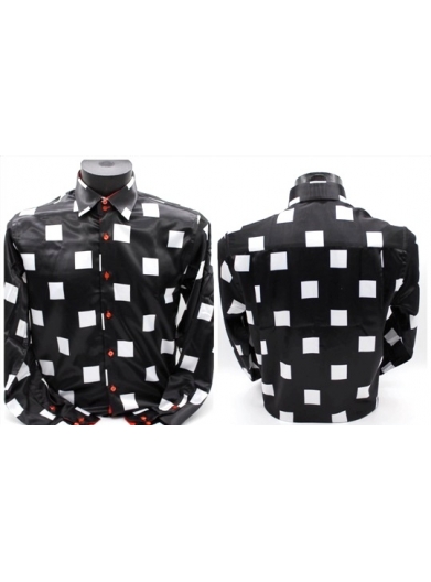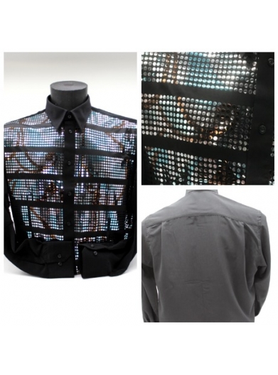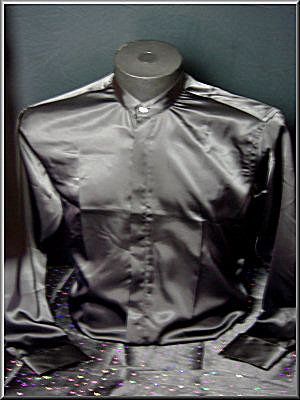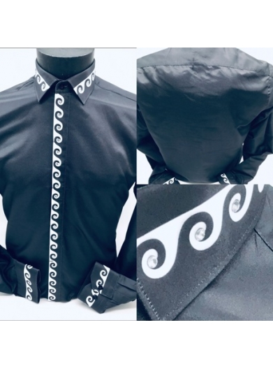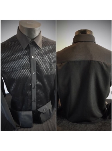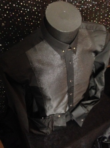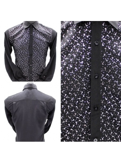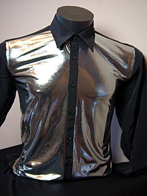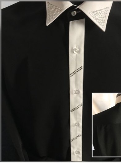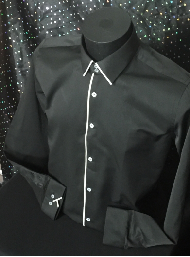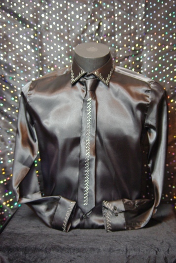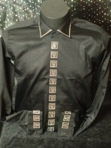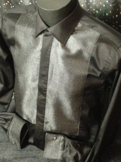 This black colour shirt with silver mid sheen shine on the front is a lending a striking design to ones stage wear collection.