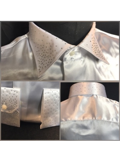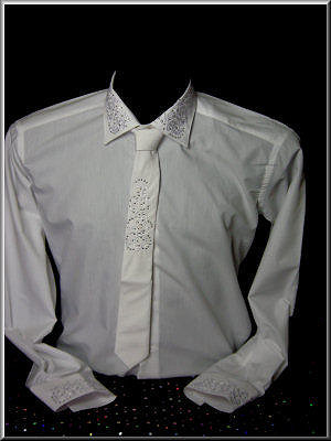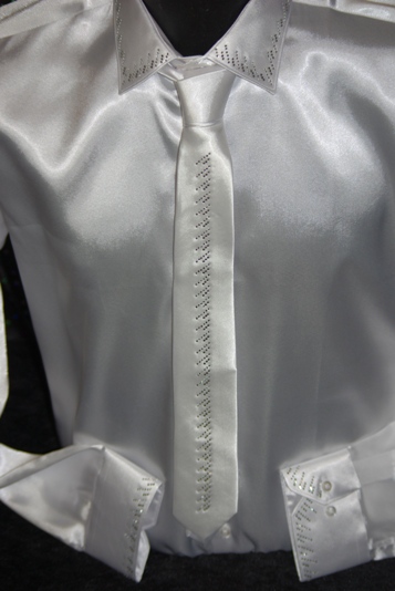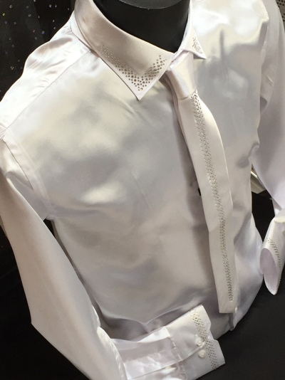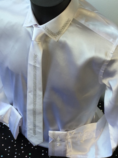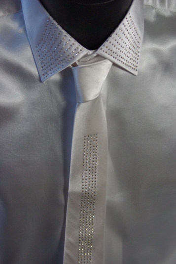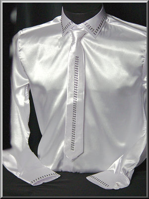 There is no limit to the creativity of this awesome diamante long sleeves shirt with matching tie in white, made in soft satin fabric, it looks great with sparkly rhinestones on the collar cuffs and also on the matching tie, the shirt & tie is an even more eye-catching design with a sparkly finish.