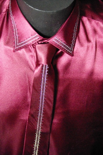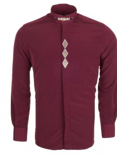 Very attractive wine colour shirt with a double strip of diamond ornaments on the collars, cuffs with matching tie.