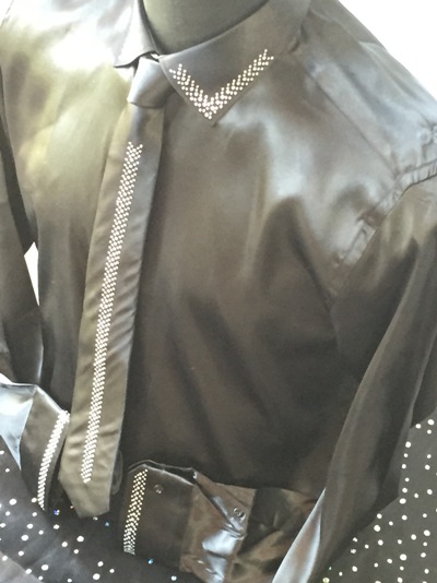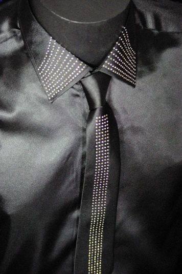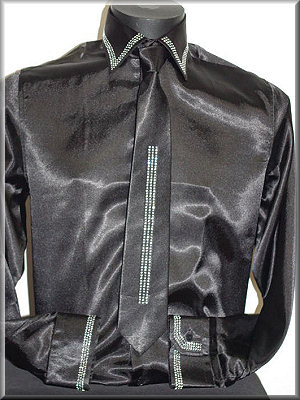 There is no limit to the creativity of this awesome diamante long sleeves shirt with matching tie in black, made in soft satin fabric, it looks great with sparkly rhinestones on the collar cuffs and also on the matching tie, the shirt & tie is an even more eye-catching design with a sparkly finish.