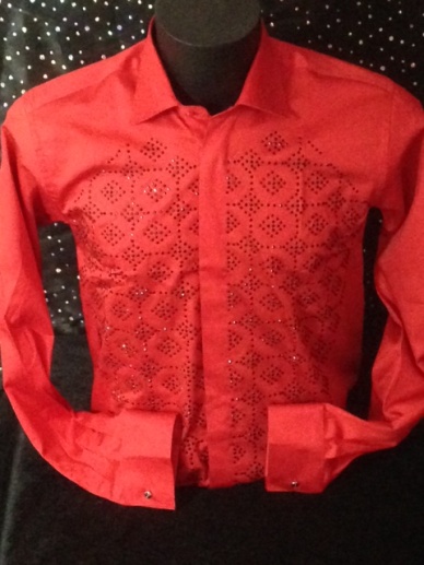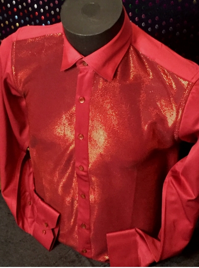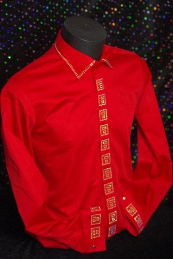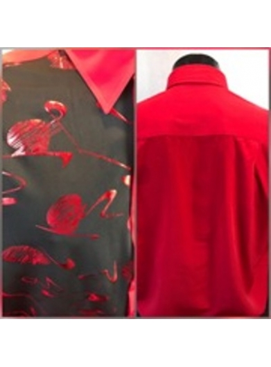 Every discerning artist needs this unique harp red shirt in his repertoire. The stagewear signature shirt with lovely high sheen gold pattern on the front.