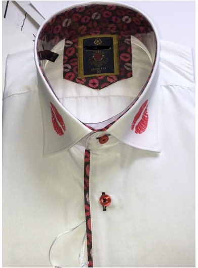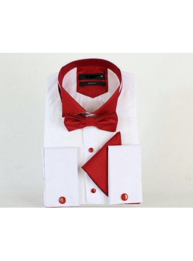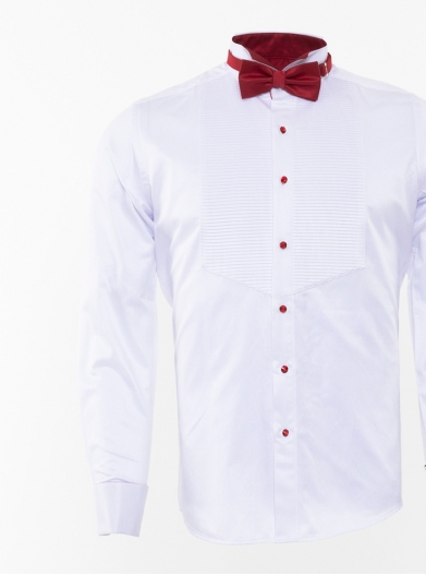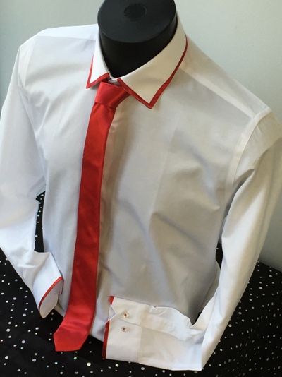 A smart dress white shirt with a red stripe around the collar and around the cuffs with matching red tie