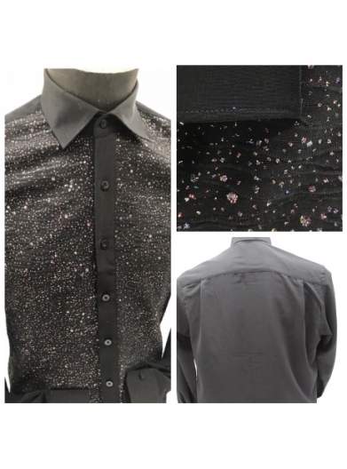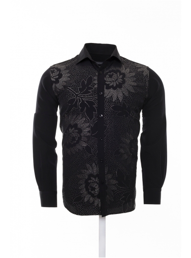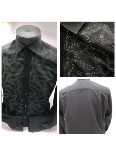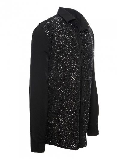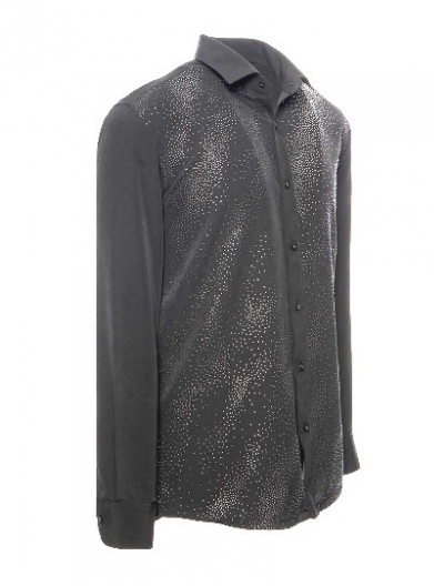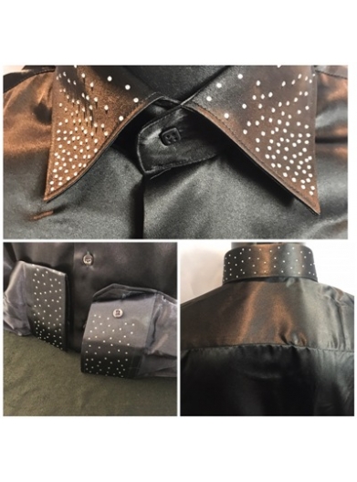 Whether classic or contemporary, beautiful crystallizes silver studs touches on the front is the central design of this black shirt with plain black long sleeves, collar, buttondown, and cuffs.