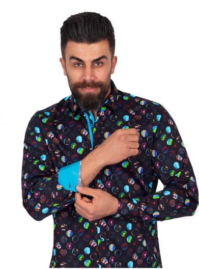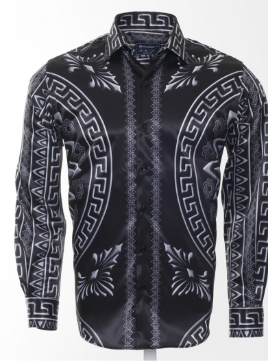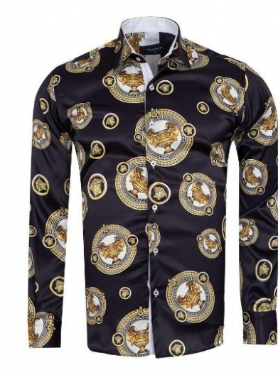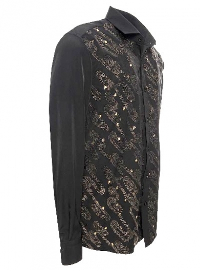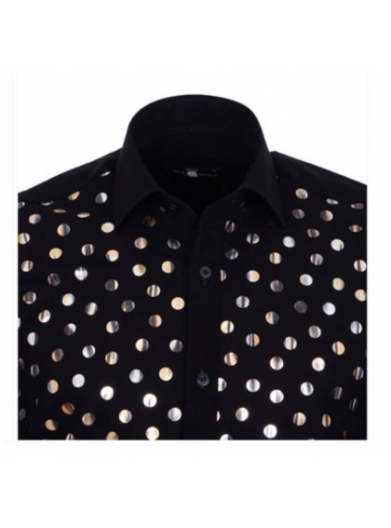 Couture all over print long sleeve black shirt made in soft satin fabric with gold circle print with a standard shirt collar and buttons which features single cuffs on the long sleeves, looks good for stagewear, party wear or any occasions.