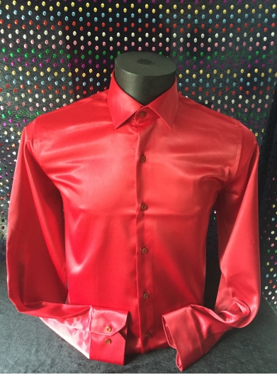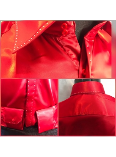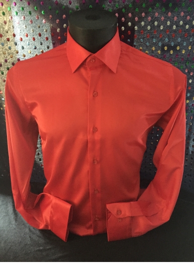 High sheen red colour shirt with plain red colour on the collars, sleeves & button down.