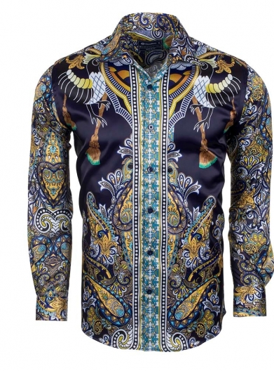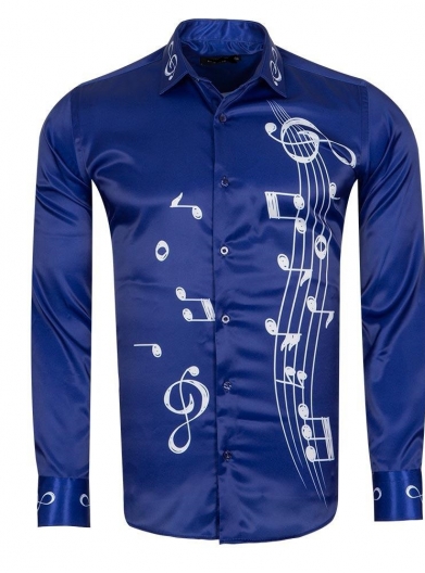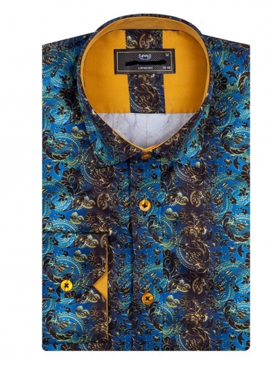 This colorful baroque white and blue shirt with gold print makes the perfect for stagewear. It is made from soft satin fabric with a classic collar, long with buttoned cuffs and a front button closure. Also suitable for party wear or any occasions.