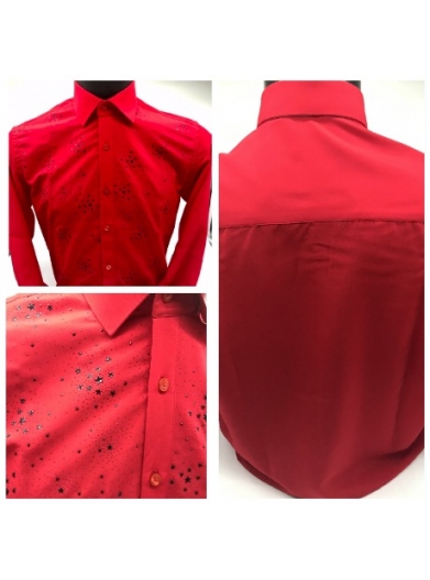 Star's is where the fans of tough glamour go; just one look at this exquisite red shirt with small black stars print on the front with plain long sleeves, collar, button-down, and cuffs are enough to understand why. This shirt constitutes the very definition of stagewear.