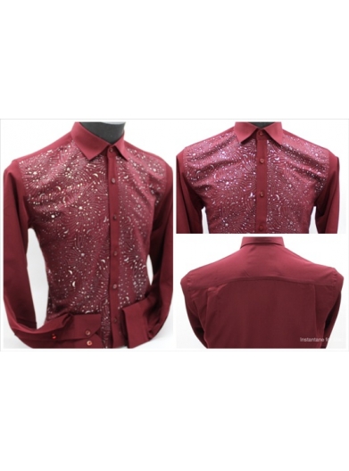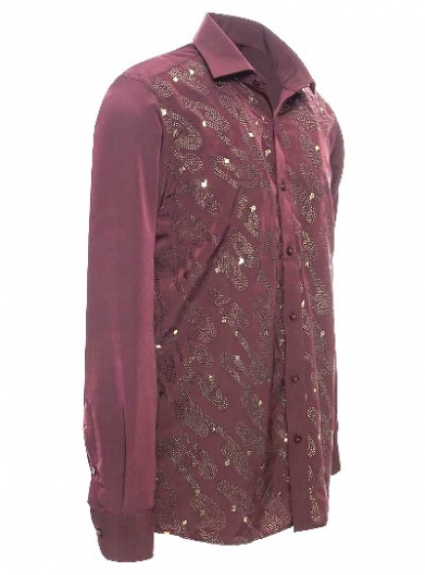 Fully embellished crystallized shirt in wine, with plain long sleeves, cuffs, plain collar, and a plain button-down, that is crafted to perfection to ensure that these designs sparkle capturing the light on the stage.