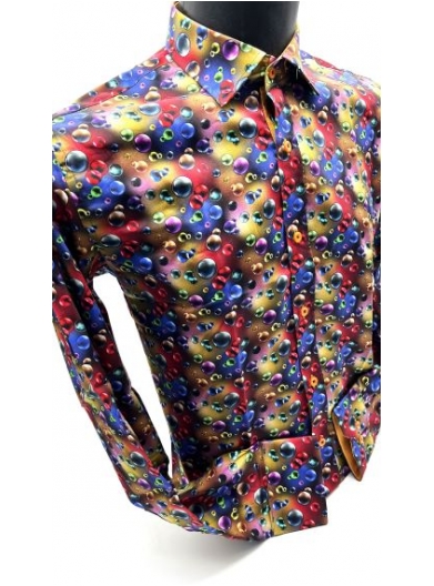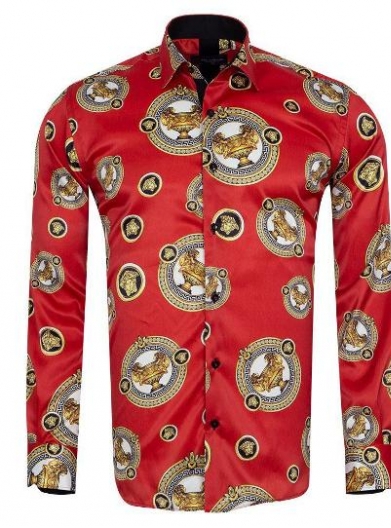 Couture all over print long sleeve red shirt made in soft satin fabric with gold circle print with a standard shirt collar and buttons which features single cuffs on the long sleeves , ideal fro stagewear, party wear or any occasions.