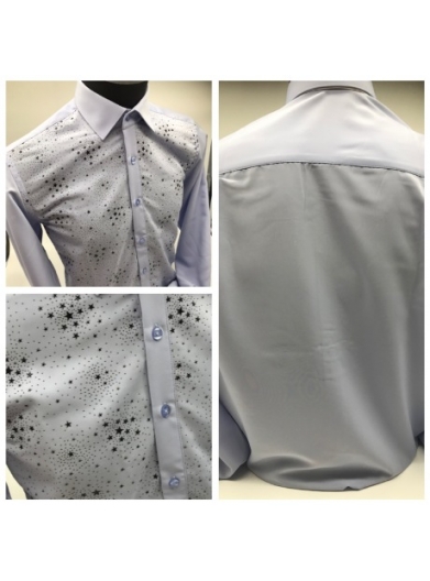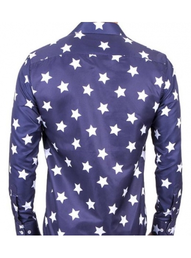 Star's is where the fans of tough glamour go; just one look at this exquisite shirt in the sky blue with small black stars print on the front with plain long sleeves, collar, button-down, and cuffs are enough to understand why. This shirt constitutes the very definition of stagewear.