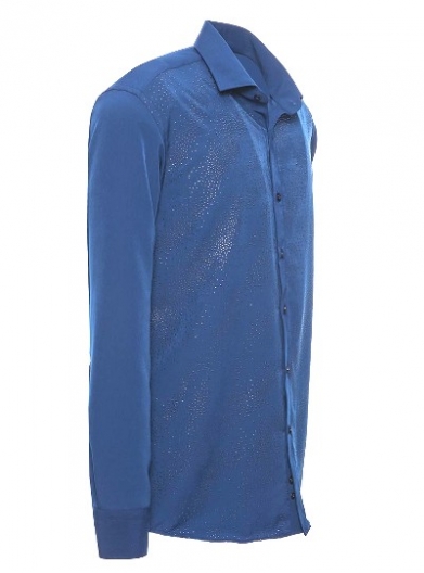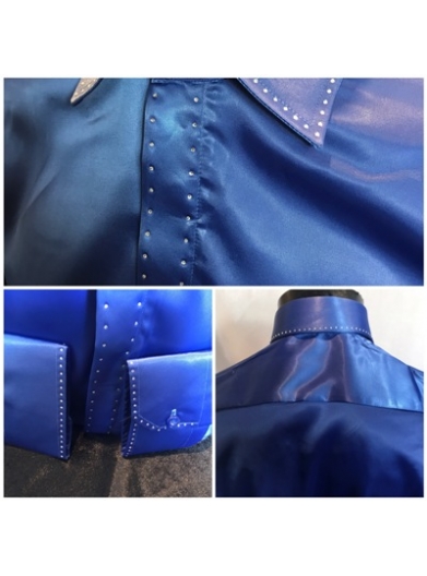 Silky royal blue shirt with diamond studs attached on collars, cuffs & tie