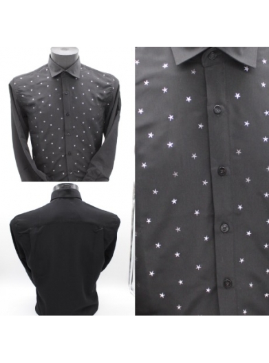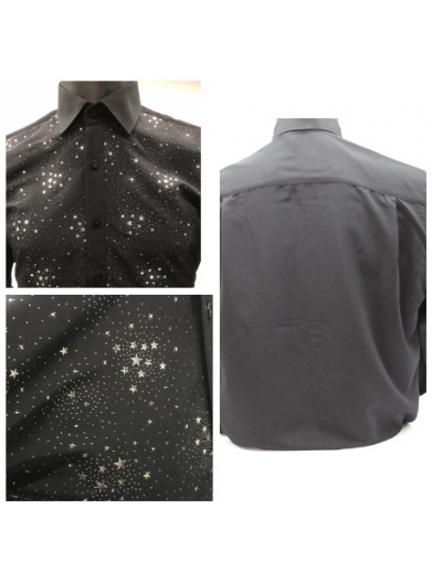 Star's is where the fans of tough glamour go; just one look at this exquisite black shirt with small sparkling silver stars print on the front with plain long sleeves, collar, button-down, and cuffs are enough to understand why. This shirt constitutes the very definition of stagewear.