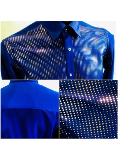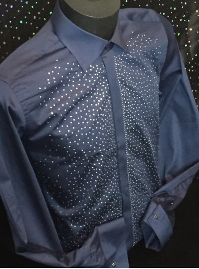 This sparkling stardust shirt in blue, with plain blue long sleeves, collar and button-down is dusted with full of high-shine stardust on the front, this shirt will stand out on the stage. Please note: Actual fabric colour may vary slightly from online photos due to variations in the screen colour and camera lens.