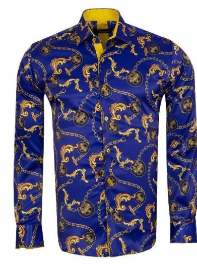 A full front couture blue shirt in gold print with a standard shirt collar which features single cuffs on the long sleeves also a baroque design on the long sleeves in gold which also features on the chest. made in soft satin fabric.