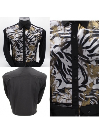 Esquire - This black silver shirt will explore the stage, the shirt has high sheen silver body on the front with gold pin on the collar to give that extra touch. unique design.
