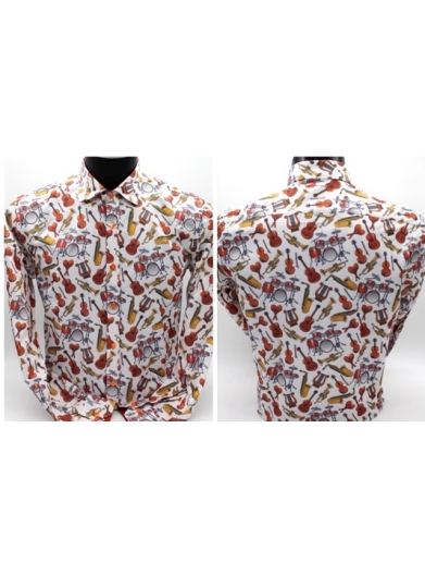 Every discerning artist needs this unique harp white shirt in his repertoire. The stagewear signature shirt with lovely high sheen gold pattern on the front.