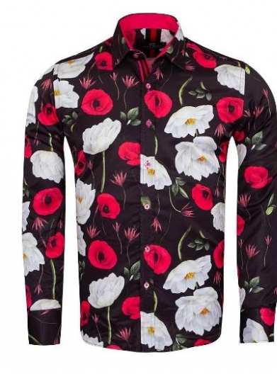 Lovely looking floral print long sleeved shirt in black. A full front standard shirt collar and button fastening cuffs on the long sleeves. An all over floral print design in red and white.